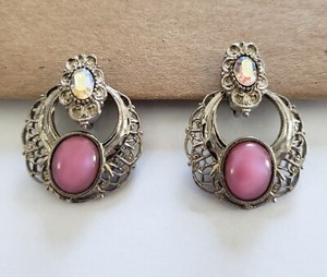 Vintage Dangle Clip On Earrings 1.75 in Pink Glass Cabochon & Faceted Rhinestone