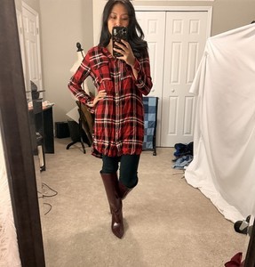 Langer rot karierter Flanell, Langarm, goldene Knöpfe, weich, Kragen, knielang