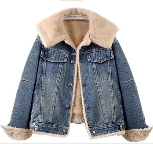 Women's Blue Denim Jean Jacket Detachable Rabbit Fur Collar Warm Lined Coat Punk