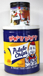 1999 Vintage TRAILS END Santa Schlitten Popcorn Dose & Humpty Dumpty Kartoffelchip Dose