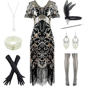20er Jahre Pailletten Gatsby Cocktail Flapper Kleider Medium schwarz silber