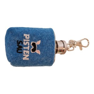 Ein blauer Flachmann mit "Pisten Sau" Aufschrift und Schwein-Motiv, silberner