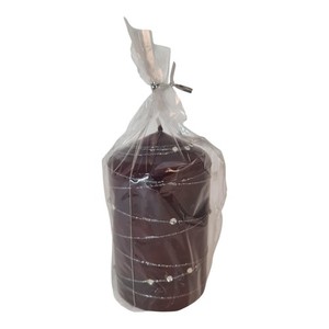Ein zylindrisches, bordeauxrote Kerze mit silbernen Glitzerlinien und Strassstei