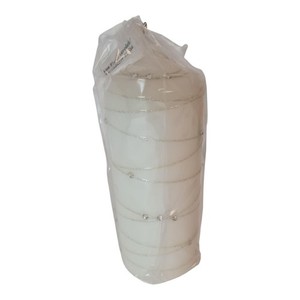 Ein elfenbeinfarbene, zylindrische Kerze, umwickelt mit silberner Glitzerkette u