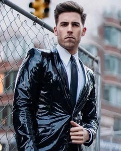 Herren Gothic Jacke Einreihige Schwarz Glänzende PVC Lack Blazer Jacke