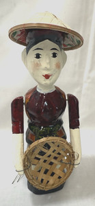 Vintage vietnamesische Wasserpuppe Frau Figur 6,5 Zoll mit Hut & Korb handbemalt