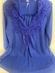 Lucky XXXL Embroidered Neckline Blue Blouse 3/4 Sleeve V-Neck Chiffon Pre-owned