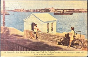 KOLONIALE FLUGGESELLSCHAFTEN-HAMILTON BERMUDA-FRAU FAHRRAD WARTET AUF FÄHRE-LEINEN POSTKARTE CHF 3,18