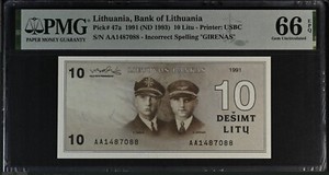 LITAUEN 10 Litu 1991, UNC, P-47a, PMG 66