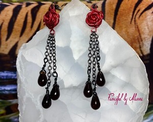 Wire Wrapped Black Rose Earrings, Gothic Blood Red Drop Earrings, Handcraft