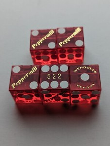 Peppermill Wendover Casino Set of 5 Matching Number Red Dice Gold Logo
