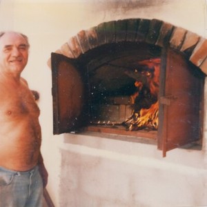 Vintage Polaroid Foto Hemdloser Mann Ziegel Ofen Holz Feuer Fund Kunst Schnappschuss