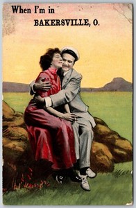 c1914 Mann umarmt Dame, wenn ich in Bakersville Ohio bin ANTIKE Postkarte 3645