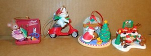 4 VINTAGE WEIHNACHTSORNAMENTE GLÄNZER BERÜHMT NÄHERIN MAUS MOTORRAD ROLLER SANTA
