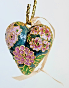 Cloisonné Puffy Herzform hängendes Ornament rosa Blumen auf dunkelgrün 2"