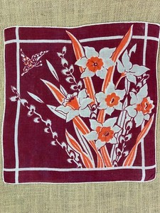 Vintage 1940's Red Daffodil Printed Cotton Hankie * Handkerchief