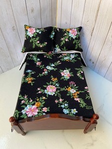 Puppenhaus Tagesdecke Decke 2 Kissen Maßstab 1:12 Twin Size Blumen Vogel auf schwarz