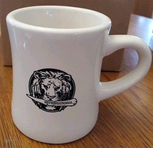 Weiße Keramik Kaffeetasse Löwenkopf hält einen Club / International darauf geschrieben