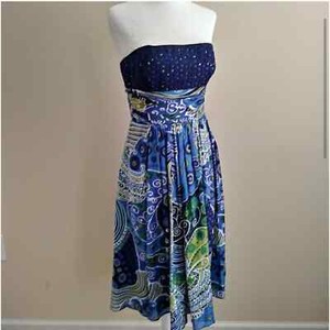 Anne Klein Kleid Gr. 6 Midi Trägerlos Seide Blau Grün Blumen Ösen Neu mit Etikett