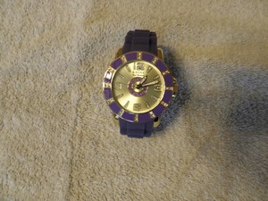 KATHY VAN ZEELAND GOLDTONE CUBIC ZIRCONIA PURPLE ACRYLIC STRAP WATCH NEW BATTERY