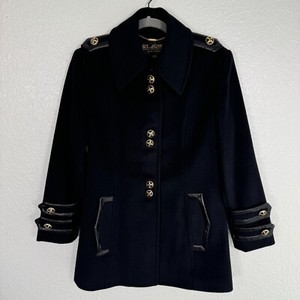 St John Jacke Damen 2 Wolle Kaschmir Angora Peacoat Mantel Lederbesatz schwarz