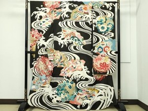 Antiker Kimono Furisode mit fließendem Wasser und glückverheißendem Blumenmuster schwarz CHF 1.848,40