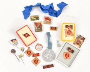 DDR, Sammlung Kleinabzeichen zum Thema Betriebssport, auf Karton geklebt