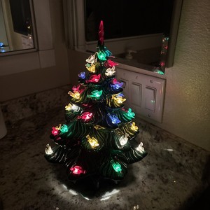 Vintage, beleuchteter grüner Weihnachtsbaum aus Keramik mit beleuchteten Vögeln & Musik