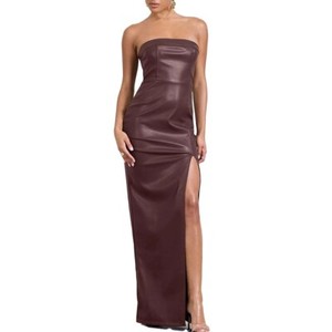 Damen braun Kunstleder langes Schlitz Kleid, Damen Leder trägerloses Bandeau Kleid