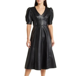 Handgefertigte Damen-Kunstleder-Puffärmel mit V-Ausschnitt mittlere Wade schwarzes Kleid