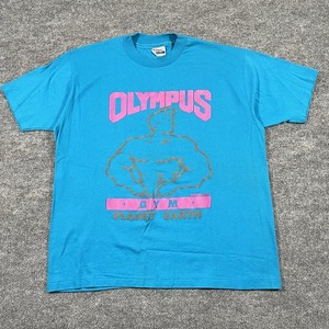 Vintage 90s Olympus Gym Shirt XL Blue Pink Puff Print Single Stitch USA Made