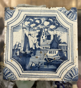 Antike Delfter Fliese, Hausbaum / Schiff Stadtlandschaft - 18. Jahrhundert