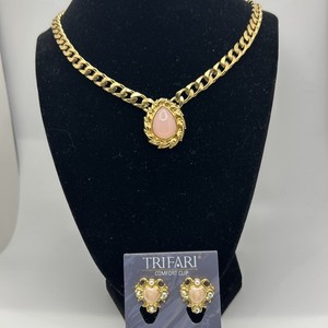 Vintage Trifari goldfarbene Halskette rosa Träne Cabochon Anhänger 17" Clip Ohrringe CHF 33,58Bisher: CHF 39,97