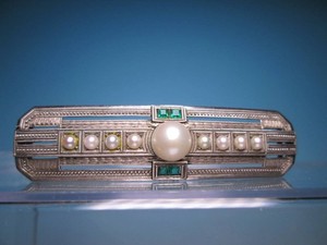 Antike SPM Obidome mit grünem Glas & Perlen japanische gravierte Metall Brosche