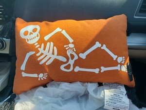 14 Zoll orange länglich Halloween Plüschkissen liegend weißes Skelett schwarze Quasten