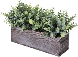Künstliche Eukalyptus Pflanzen im rustikalen rechteckigen Pflanzkasten aus Holz grün