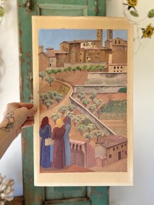 Original Vintage Gouache Gemälde um 1920 30er Jahre französisches oder toskanisches Dorf ohne Rahmen