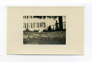 Samojede? weißer Hund, lockiger Schwanz, pflichtbewusst posiert, sieht gelangweilt aus, RPPC Postkarte CHF 9,62