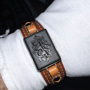GELBES LEDER ARMBAND HERREN/DAMEN ARMBAND GRAVIERT AQEEQ SILBER RAHMEN