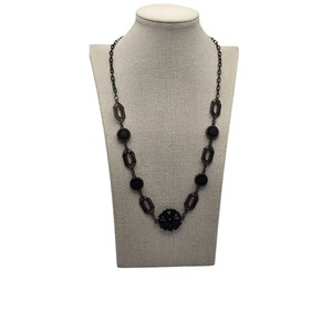 Vintage Schwarz Glas Art Deco Halskette Antik Metall Filigran Blumen Tropfen