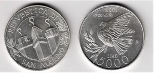 2001 San Marino Lire 5000 Argento La Pace Fior Di Conio Unc