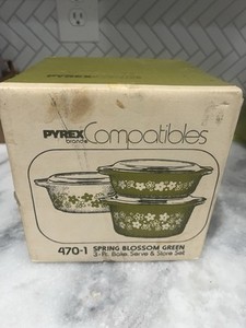 Vintage Pyrex Frühlingsblüte grün 470-1 3-teiliges Backen Servieren Aufbewahrung Set mit Box