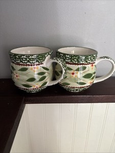 EULENBECHER HANDBEMALT Keramik Ton Kunst Weiß Grün Blau Kaffeetasse 16 Unzen