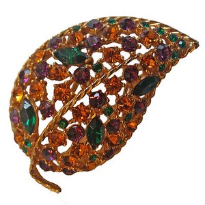 Large Vintage Fall Colors Rhinestones Leaf Brooch.