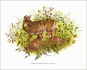 1979 Vintage Print White Tailed Deer Spotted Fawn Farn Leaves Art James Lockhart