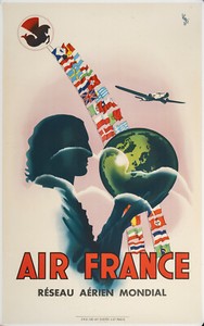 Original Air France Plakat, Vinci, Frau Weltreise, Flaggen Luftfahrt Erde 1937