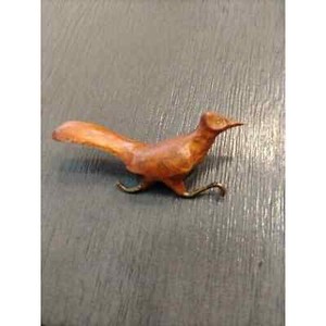 HOLZGESCHNITZTE ROADRUNNER BROSCHE MIT GELBEM GLASAUGE UND MESSINGBEINEN - SÜSS!