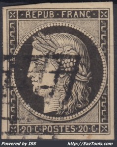 FRANCE CERES 20c NOIR SUR BLANC N°3a AVEC OBLITERATION GRILLE