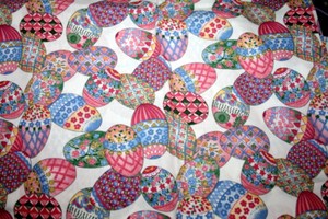 DECCORATED EASTER EGGS ON WHITE FROM HI FASHION FABRICS - 100% COTTON FABRIC