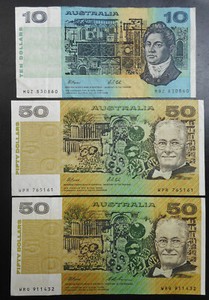 3 Australien Papier Banknoten 10 $, 50 $, 1992, Cole / Fraser, Evans 1994 AUD Dollar